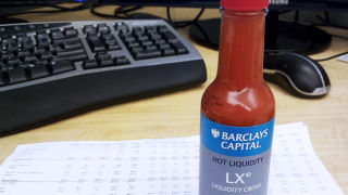 The answer, shockingly, is a tame habanero "hot" sauce dubbed "Hot Liquidity" and branded with the name of Barclay's Liquidity Cross (LX®) "dark pool" trading firm. Not a novelty ghost pepper hot sauce, not an English-bred infinity chili (which would have been exceptionally appropriate for the British financial services company), but a weak-ass habanero.