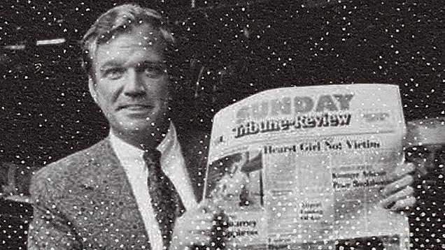[lightly filtered image of Scaife holding his first Sunday edition of the Pittsburgh Tribune-Review via the Tribune-Review file. His full ensemble in this is a sight to see.]