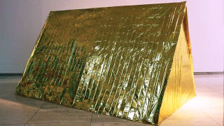 Dutch artist Sarah van Sonsbeeck is showing an Anti-Drone Tent now at Mediamatic Fabriek in Amsterdam. It promises to shield users from aerial infrared surveillance by hiding them beneath the heat-reflective surface of a Mylar® space blanket. It's a neat idea. That's why the Taliban has been using it for years.